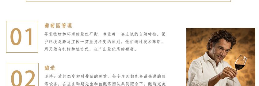 味蕾:酒體圓潤柔順,層次豐富,平衡感極佳,果香濃郁,余味中帶有各種香料的味道。