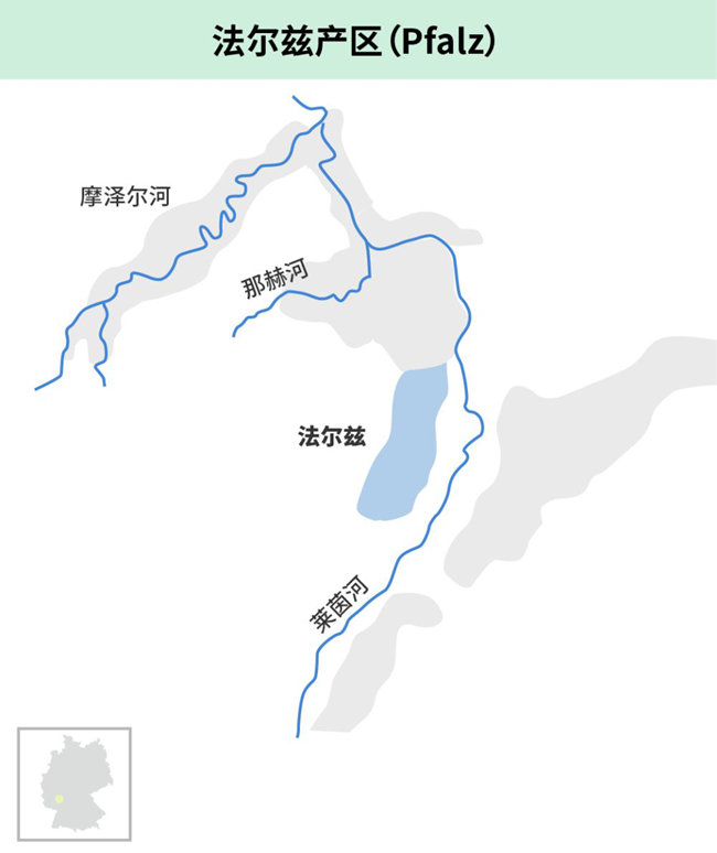 法爾茲產(chǎn)區(qū)位于德國(guó)的西南部,地處哈茨山(Haardt Mountains)和萊茵河之間,北接萊茵黑森(Rheinhessen),南部、西部則與法國(guó)接壤,其葡萄園南北綿延80余公里。從面積上來說,法爾茲是德國(guó)第二大產(chǎn)區(qū),但其產(chǎn)量時(shí)常能夠占據(jù)13產(chǎn)區(qū)之首。
