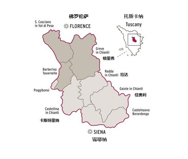 經(jīng)典基安帝產(chǎn)區(qū)地處托斯卡納(Tuscany)大區(qū)中部的佛羅倫薩市(Florence)與錫耶納市(Siena)之間,總占地7萬余公頃,在行政區(qū)域上涉及9個市鎮(zhèn),涵蓋了拉達(Radda in Chianti)、佳奧利(Gaiole in Chianti)、卡斯特里納(Castellina in Chianti)和格里弗(Greve in Chianti)這四個市鎮(zhèn)的全部地域以及其余5個市鎮(zhèn)的部分地域。