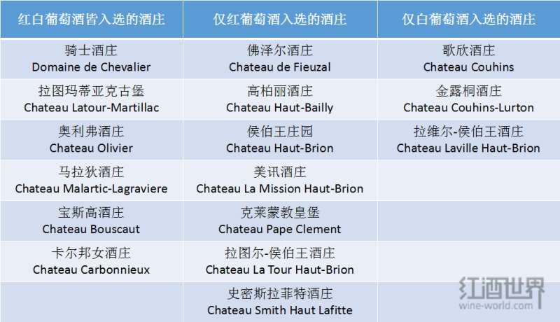 直到1953年,法國(guó)國(guó)家原產(chǎn)地命名管理局(Institut National des Appellations d'Origine,簡(jiǎn)稱INAO)對(duì)格拉夫的紅葡萄酒進(jìn)行評(píng)級(jí),并擬定了一份非官方名單,共有13座酒莊入選。1959年,該分級(jí)制度在原來(lái)的基礎(chǔ)上新添了對(duì)格拉夫干白葡萄酒的評(píng)級(jí)。在最終公布的官方名單中,共有16座列級(jí)莊入選,其中紅、白葡萄酒均入選的有6座,僅紅葡萄酒入選的有7座,僅白葡萄酒入選的有3座。