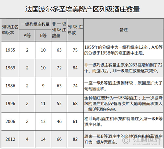 右岸的圣埃美隆葡萄酒商會在上世紀(jì)50年代決定起草一份列級酒莊分級制度,分為兩大等級,一個是分為A、B兩等的一級列級酒莊(Premier Grand Cru Classe),另一個是列級酒莊(Grand Cru Classe)。與1855年波爾多分級體系不一樣的是,圣埃美隆酒莊的評級結(jié)果并不是一成不變的。