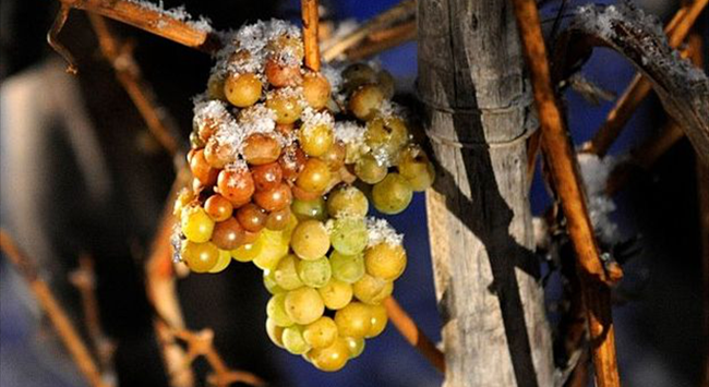 為了釀制冰酒,酒莊需要做足準備。在秋季葡萄成熟的時候,要用保護網(wǎng)罩住葡萄藤,以保護葡萄果實不被鳥類吞食。葡萄會一直留在葡萄藤上,直至室外溫度達到要求后才能采收。在這段時間里,葡萄脫水,汁液濃縮,賦予了冰酒特有的復(fù)雜性。