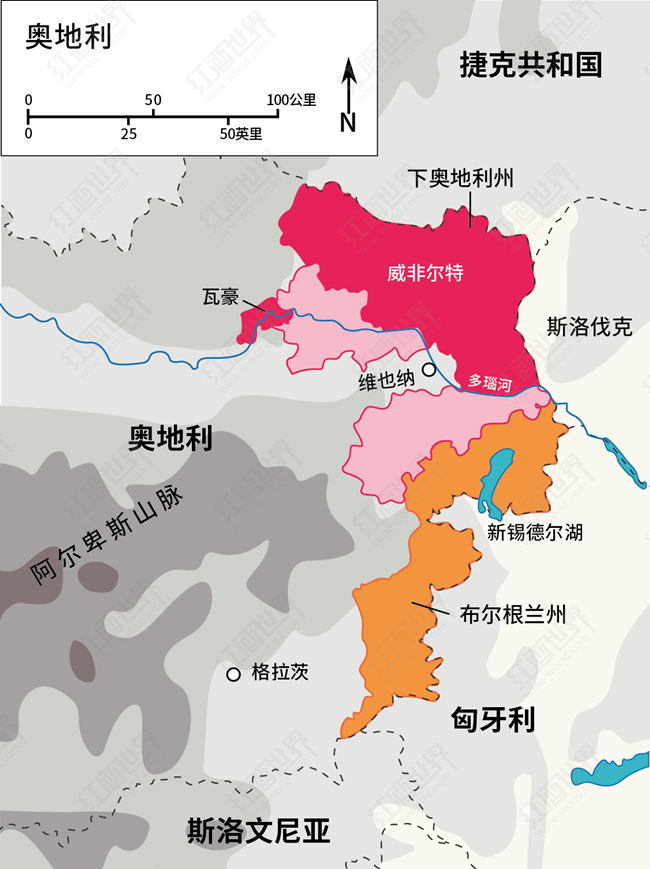 奧地利的葡萄酒產(chǎn)區(qū)與勃艮第處于同一緯度,但由于該國位于歐洲中部地區(qū),其氣候比勃艮第更具大陸性特征。北部產(chǎn)區(qū)會(huì)受到較冷的北風(fēng)影響,而與匈牙利接壤的東部地區(qū)則享有較溫暖的東風(fēng)。阿爾卑斯山覆蓋著奧地利的西部,因此葡萄種植區(qū)主要分布在該國的東部。這些葡萄種植區(qū)以涼爽的大陸性氣候?yàn)橹?,冬季嚴(yán)寒多雪,夏季溫暖短暫,秋季陽光明媚,本土葡萄品種在這樣的氣候條件下能夠很好地生長。