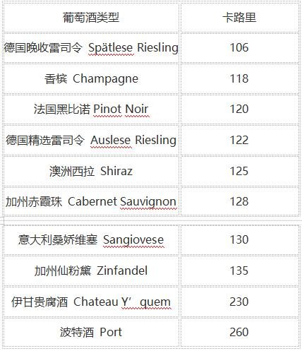 幾種常見(jiàn)類型的葡萄酒所含熱量之對(duì)比(150ML)