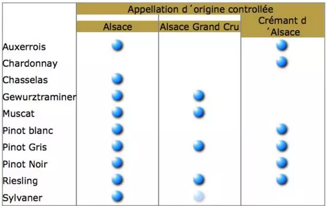 阿爾薩斯三種原產(chǎn)地命名制度和葡萄品種對(duì)應(yīng)圖