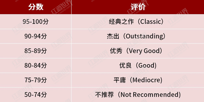 為了提升雜志的內(nèi)(nèi)容質(zhì)(zhì)量,WS在給新發(fā)(fā)布的酒款做品評的同時,也在不斷改進自己的評價機制。從修正版加州大學(xué)戴維斯分校九分制(Modified UC Davis Nine-point Scale)到歐洲二十分制,再到挑選出“觀者之選(Spectator Selections)”、“高性價比(Best Buys)”和“不推薦(Not Recommended)”酒款,WS對葡萄酒的評價機制幾經(jīng)(jīng)變換。1985年,WS決定采用百分制來評價葡萄酒并沿用至今。百分制以50分為起評分,將酒款劃分為六個等級: