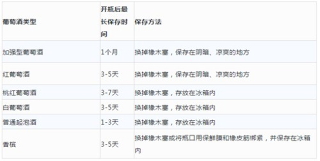 不同類型葡萄酒開瓶后最長保存時(shí)間