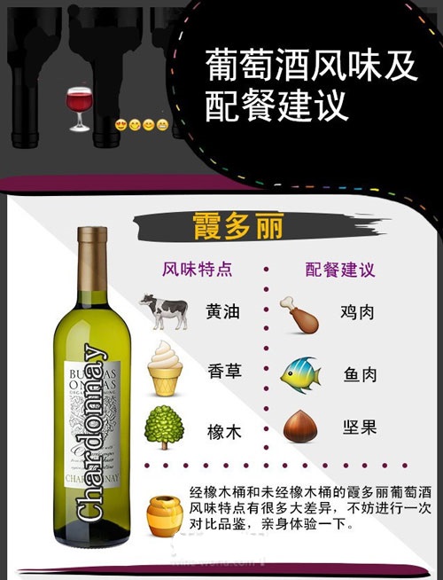 東莞藍(lán)菲城堡葡萄酒代理商用6張圖片列出最主要的6種葡萄酒,并簡(jiǎn)要說(shuō)明相應(yīng)的風(fēng)格特點(diǎn)和配餐建議。比如稱得上“千面女郎”的霞多麗葡萄酒,即可以清新脆爽,也可以豐滿順滑,而決定其風(fēng)格的,除品種本身外,還有釀酒工藝,尤其是橡木桶的使用。【