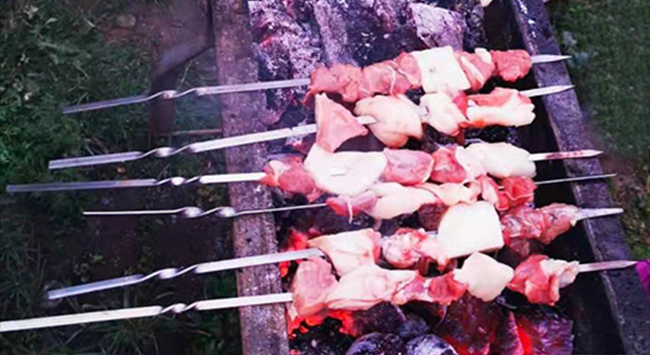 烤羊肉串是一種流行于中東、南亞、中亞、地中海、東亞等多個地區(qū)的羊肉菜式。在中國,烤羊肉串的歷史可追溯至東漢時期,20世紀80年代以來隨著時代的發(fā)展,在大江南北傳揚開來??狙蛉獯此坪唵?,要保證羊肉既入味又鮮嫩卻并非易事,工序也十分考究——取新鮮羊肉或切片切塊,串穿在細鐵釬上,放置在烤爐上焙烤,再撒上些辣子面、胡椒粉和孜然粉等,不斷翻動,烤至雙面金黃,肉質熟透。
