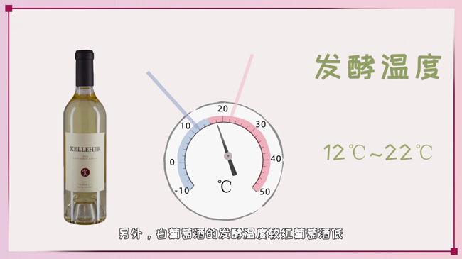 ② 發(fā)酵溫度較紅葡萄酒低。白葡萄酒的發(fā)酵溫度為12-22℃,此溫度范圍可避免葡萄品種芳香物質(zhì)的流失;而紅葡萄酒的發(fā)酵過(guò)程中需要提取葡萄果皮的顏色和單寧,因此溫度較高,為20-32℃。
