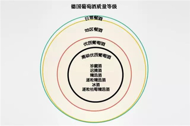 從圖中可以得知,目前德國葡萄酒主要分為 4 個等級,由低到高分別是:日常餐酒(Deutscher Wein)、地區(qū)餐酒(Landwein)、優(yōu)質(zhì)葡萄酒(Qualitatswein bestimmter Anbaugebiete,簡稱 QbA)和高級優(yōu)質(zhì)葡萄酒(Qualitaswein mit Pradikat,簡稱 QmP,2007 年更名為 Pradikatswein)。其中高級優(yōu)質(zhì)葡萄酒下又有 6 個細(xì)分,分別如下: