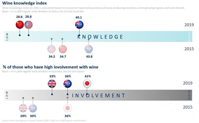 與此同時,在2015年至2019年期間,中美兩國消費者對葡萄酒的了解程度卻大幅下降。中國消費者的葡萄酒知識指數(shù)(shù)下降6點,從34.7降至28.6;而美國消費者的葡萄酒知識指數(shù)(shù)同樣也下降了6點,從34.2降至28.8。葡萄酒情報公司W(wǎng)ine Intelligence的“葡萄酒知識回顧指數(shù)(shù)”是根據(jù)(jù)消費者對葡萄酒生產(chǎn)國、地區(qū)(qū)、品種和品牌的認知度來計算的,以0到100的比例表示,分數(shù)(shù)越高,知識就越多。