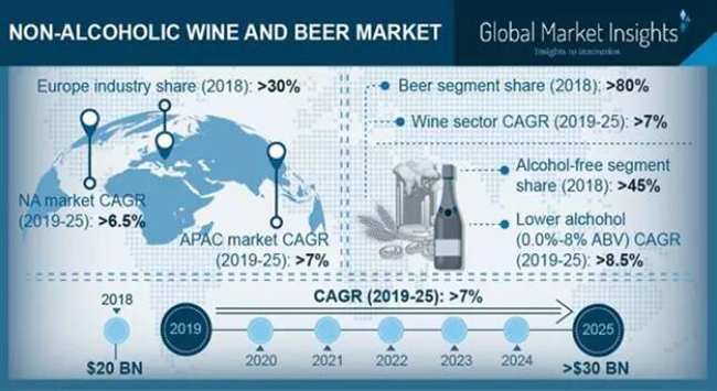 根據(jù)全球市場洞察(Global Market Insights)2019年發(fā)布的報告,2018年無醇葡萄酒和無醇啤酒市場規(guī)模為200億美元,預計從2019年到2025年,年復合增長率將超過7%,達300億美元,以下是部分數(shù)據(jù):