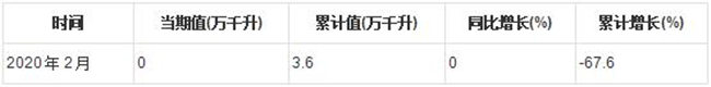 2020年1-02月全國葡萄酒產(chǎn)量累計值為3.6萬千升,累計下降67.6%。