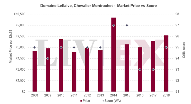 最后,下圖比較了勒弗萊的Chevalier Montrachet(該品牌交易最活躍的葡萄酒)最近十個年份的市場價格。 它最新的2018年份自去年12月在英國發(fā)布以來,市場價格已漲了19%。