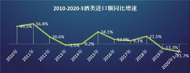 過去十年,每年的酒類進口總額除了2013年這一年有微幅下降以外,其他的年份總體都屬于增長的狀態(tài)。但2019年卻有了一個明顯的下降。而2020年,受疫情影響,前三個月甚至出現了負增長,幅度為21.7%。就此來看,2020年形勢不容樂觀。