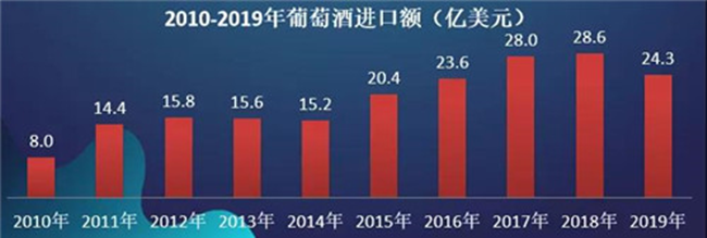 2020年一季度,中國進口酒類金額8.7億美元,同比下降21.7%。2010—2019年,十年間的年均復合增長率為13.8%。
