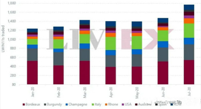 2020年上半年交易的獨(dú)立葡萄酒數(shù)(shù)量比2019年同期增長(zhǎng)了37%。下半年初更加強(qiáng)勁,7月份交易的獨(dú)立葡萄酒數(shù)(shù)量(LWIN7)更首次突破1,000;并比之前最高月份高出超過(guò)20%(如下所示)。