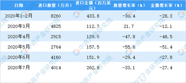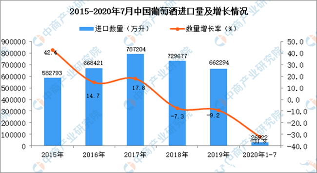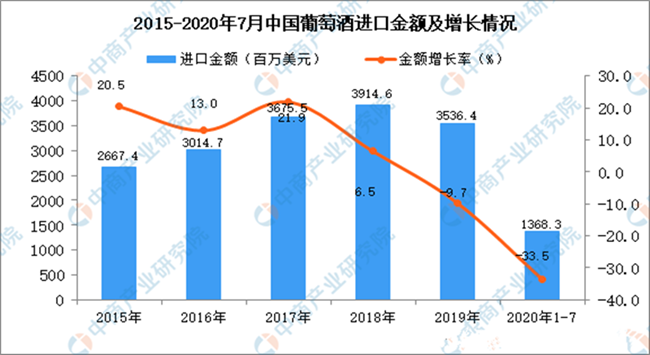 2020年1-7月中國(guó)葡萄酒進(jìn)口量及金額增長(zhǎng)情況