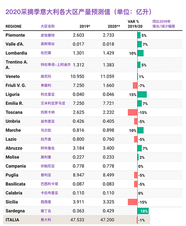 從意大利國內(nèi)各大區(qū)的葡萄酒產(chǎn)量來看,今年意大利北部的葡萄酒產(chǎn)量同比2019年略增加了3%,中部和南部則分別減少了2%和7%。