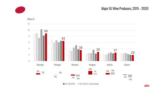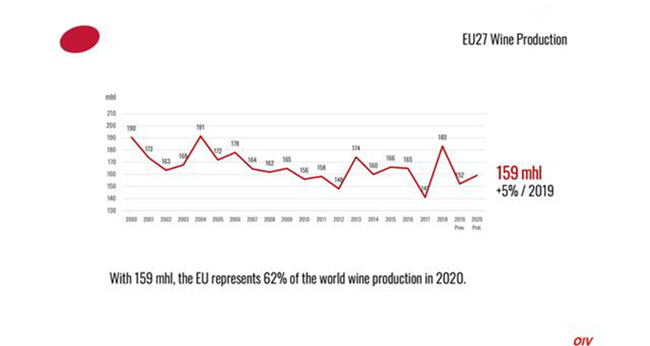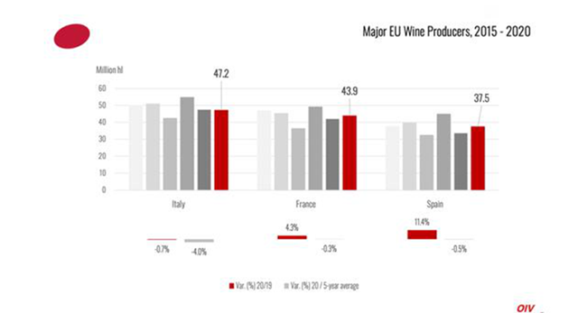 北半球2020年的采收并未受到因疫情封鎖措施的強(qiáng)烈影響。2020年,歐盟國家葡萄酒產(chǎn)量為159億升(mhl),占全球總產(chǎn)量的62%。