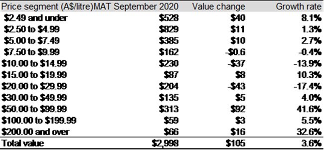 在截至2020年9月的12個(gè)月中,澳大利亞葡萄酒的平均出口額增長(zhǎng)了4%至3.89澳元/升(離岸價(jià)),這一數(shù)據(jù)也和總出口額的增長(zhǎng)相匹配。出口量小幅下降0.4%至7.71億升(等量于8570萬(wàn)箱9升裝)。