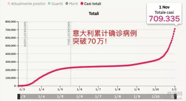 據意大利衛生部11月1日公布的最新統計數據,過去24小時意大利全國新增新冠病毒感染病例29907例,累計感染709335例;新增死亡208例,累計死亡38826例;累計治愈292380例,其中新治愈2954例。