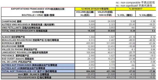 根據(jù)(jù)WBO發(fā)(fā)布的2018年法國(guó)各產(chǎn)(chǎn)區(qū)(qū)葡萄酒進(jìn)(jìn)出口中國(guó)大陸地區(qū)(qū)的數(shù)(shù)據(jù)(jù)顯示,去年幾乎大部分產(chǎn)(chǎn)區(qū)(qū)出口中國(guó)的量額出現(xiàn)(xiàn)下跌。