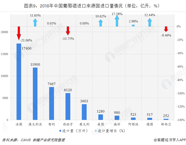 根據中國海關數據顯示,2018年,受經濟放緩和中美貿易戰的影響,中國葡萄酒進口量出現2014年來首次下滑,進口量為67.9萬千升,下降8.95%;進口額則出現一定程度增長,達28.2億美元,增長1.1%。從“量跌價升”的現象可推測,隨著國內消費升級的推進,目前中國進口葡萄酒結構主要以高端酒為主。