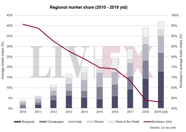 在2018年度報(bào)告中,我們發(fā)現(xiàn)優(yōu)質(zhì)葡萄酒市場(chǎng)不斷擴(kuò)大,買家對(duì)更多不同酒區(qū)的葡萄酒的興趣不斷增加。2019年至今,除了這多元化的趨勢(shì)繼續(xù)保持,勃艮第的交易份額也創(chuàng)新高。