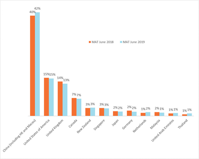澳大利亞葡萄酒在中國表現非常良好?;仡?019年的前5個月,澳大利亞在進口額上成為中國大陸排名第一的葡萄酒進口來源國。同時,在全球葡萄酒進口市場總量下挫22%的情況下,澳大利亞葡萄酒在中國大陸的表現依然強勢,其市場份額相比于2015年增長了13%,達到了進口總量的24%。澳大利亞鞏固了其作為中國市場優質葡萄酒主要供應商的顯赫地位。