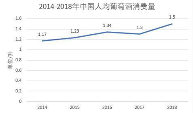 如上圖數據顯示,從2014-2018年,中國的葡萄酒人均消費量從1.17升上漲至1.5升,增長了28.2%,顯示出中國市場葡萄酒消費的強勁增長態勢。