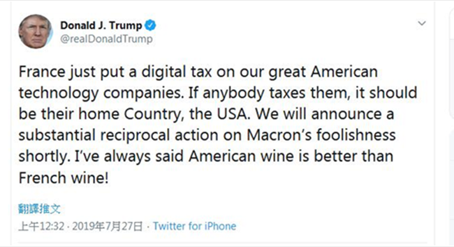 作為對法國近期宣布對全球科技巨頭征收數(shù)(shù)字服務(wù)稅的回應(yīng),據(jù)(jù)美國《紐約時報》報道,特朗普26日先是在推特上表示,“法國剛剛對我們偉大的美國科技公司征收一項數(shù)(shù)字稅,如果說有人要向他們征稅,那也應(yīng)該是他們的祖國——美國。”