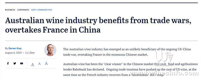 2018年澳洲對(duì)(duì)中國(guó)(guó)葡萄酒出口量上漲19.8%,且在2019年的前4個(gè)(gè)月中更是上漲了25.7%。(網(wǎng)(wǎng)頁(yè)截圖/《時(shí)(shí)代報(bào)(bào)》)