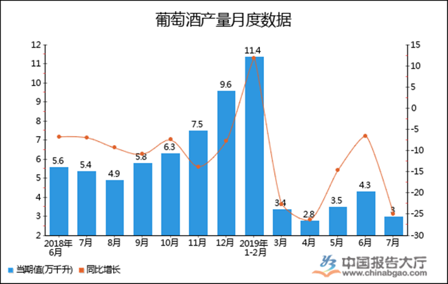 2019年7月全國(guó)葡萄酒產(chǎn)(chǎn)量為3萬(wàn)千升,累計(jì)值為23.7萬(wàn)千升,同比下降25%,累計(jì)下降23.1%。