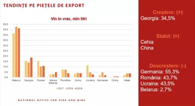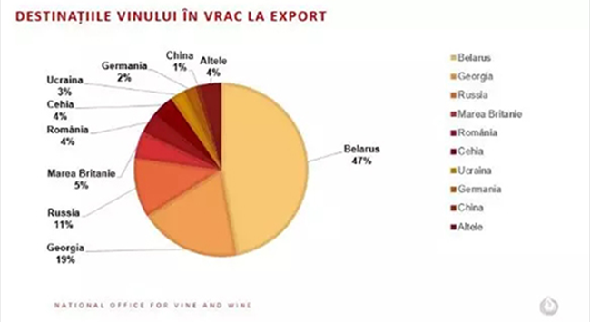 在2018-2019葡萄酒年度,摩爾多瓦共和國(guó)葡萄酒出口總量為14.1萬千升(-1.8%),其中包含4.24萬千升(56716.904瓶)瓶裝葡萄酒(-1.5%)以及9.82萬千升(-1.8%)散裝葡萄酒。