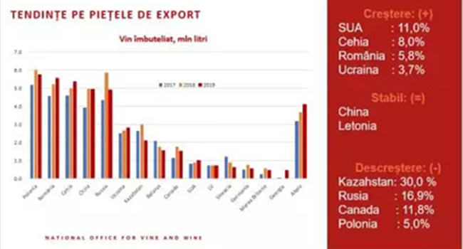波蘭、羅馬尼亞、捷克、中國(guó)和俄羅斯仍然是摩爾多瓦瓶裝葡萄酒的主要市場(chǎng)。出口到美國(guó)(+11%)、捷克共和國(guó)(+8%)、羅馬尼亞(+5.8%)、烏克蘭(+3.7%) 的瓶裝葡萄酒數(shù)(shù)量有所增加,出口到中國(guó)和拉脫維亞的數(shù)(shù)量保持穩(wěn)(wěn)定,但是出口至哈薩克斯坦(-30%)、俄羅斯(-16.9%)、加拿大(-11.8%)、波蘭(-5%)的瓶裝葡萄酒數(shù)(shù)量有所下降。