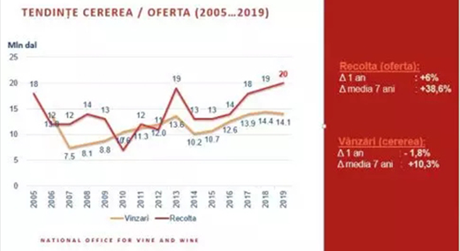 在2018-2019葡萄酒年,基于過去兩年創(chuàng)(chuàng)紀(jì)(jì)錄的大收成,葡萄酒供需比基本上達(dá)(dá)到了自2013年實(shí)(shí)施禁運(yùn)(yùn)后的數(shù)(shù)值。過去7年的平均數(shù)(shù)據(jù)(jù)顯示,鑒于摩爾多瓦共和國(guó)85%的葡萄酒銷往國(guó)外,產(chǎn)(chǎn)自摩爾多瓦的葡萄酒是出口市場(chǎng)所能消化的4倍。