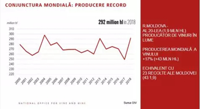 不僅是摩爾多瓦共和國(guó)正在經(jīng)(jīng)歷葡萄酒生產(chǎn)(chǎn)過剩。2018年全球葡萄產(chǎn)(chǎn)量也達(dá)(dá)到了創(chuàng)(chuàng)紀(jì)(jì)錄的水平(+17%,即430萬千升),增長(zhǎng)量相當(dāng)(dāng)于摩爾多瓦共和國(guó)23年的葡萄收獲量。