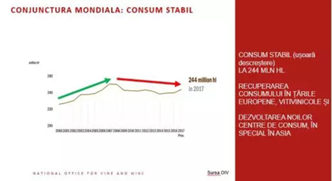 在過去14年中,全球盛產(chǎn)(chǎn)葡萄酒,且十年來葡萄酒消耗量陷入停滯,導(dǎo)(dǎo)致葡萄酒供大于求。摩爾多瓦共和國(guó)更是連續(xù)(xù)兩次取得創(chuàng)(chuàng)紀(jì)(jì)錄的豐收,并設(shè)(shè)法保持主要出口指標(biāo)(biāo)相對(duì)穩(wěn)(wěn)定,出口量小跌但影響甚微。