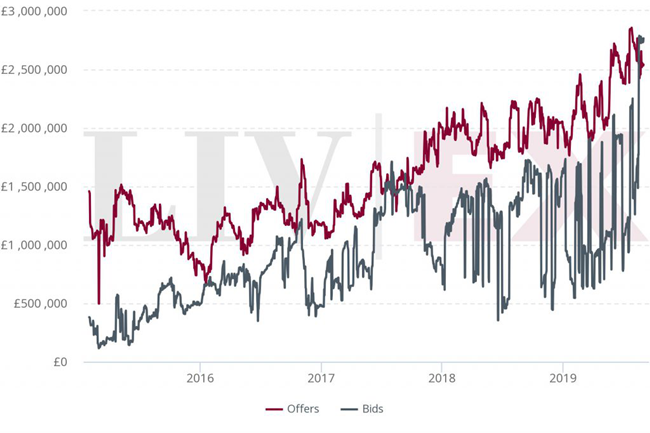 如上圖所示,早于2015年,意大利的出價(jià)和報(bào)價(jià)總值已接近200萬英鎊。 現(xiàn)在,這數(shù)字更已超過500萬英鎊,很大程度上是由活躍買家所推動(dòng); 由此可反映市場對(duì)意大利葡萄酒的興趣日增。