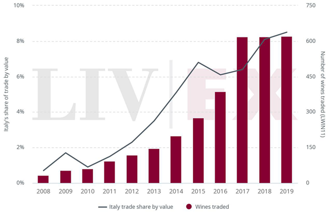 隨著更多意大利葡萄酒供應(yīng),使該酒區(qū)的交易價(jià)值和數(shù)量也同在增加。事實(shí)上,現(xiàn)在意大利只僅次于波爾多和勃艮第,已成為第三大活躍酒區(qū),其交易總值份額已由2010年時(shí)的不到2%攀升至本年迄今的8.5%;這使葡萄酒生產(chǎn)商、國際酒商和收藏家人人受益。