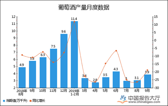 以上就是2019年1-9月全國葡萄酒產(chǎn)量統(tǒng)計,數(shù)據(jù)來源于國家統(tǒng)計局及中國報告大廳數(shù)據(jù)中心整理發(fā)布,僅供參考。