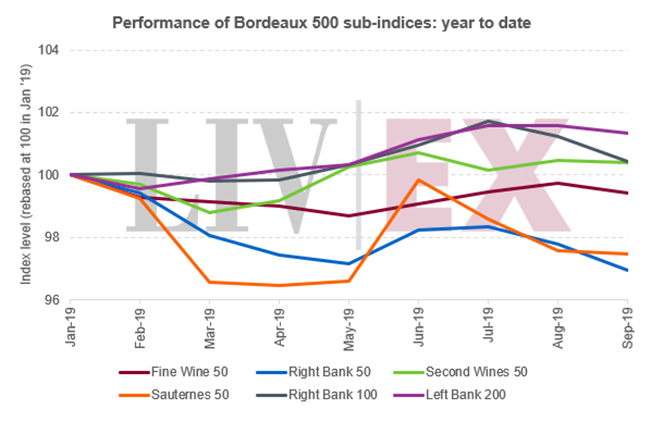 本年至今,波爾多的表現好壞參半。在其分項指數中,右岸50跌幅最大(-3.1%),緊隨其后的是蘇玳 50(-2.5%)。