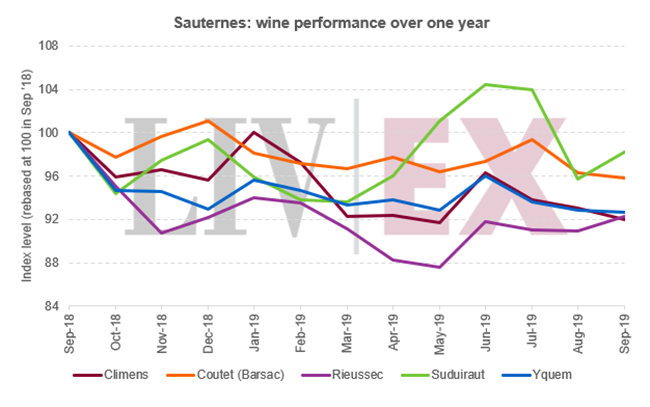 在過去的一年,蘇玳50中的成份葡萄酒無一漲價。如下圖所示,克里蒙Climens跌幅最大(-8.0%),而旭金堡Suduiraut跌幅最小(-1.8%);而最近發布的伊甘Yquem 2017年也跌價7.3%。
