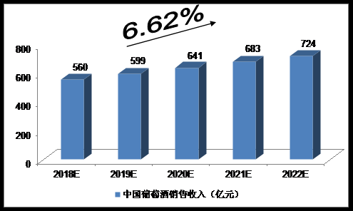 2016年,全國規(guī)模以上葡萄酒企業(yè)共240家,累計(jì)實(shí)現(xiàn)銷售收入484.54億元,同比增長3.97%。我們預(yù)計(jì),2018年我國葡萄酒銷售收入將達(dá)到560億元,未來五年(2018-2022)年均復(fù)合增長率約為6.62%,2022年將達(dá)到724億元。