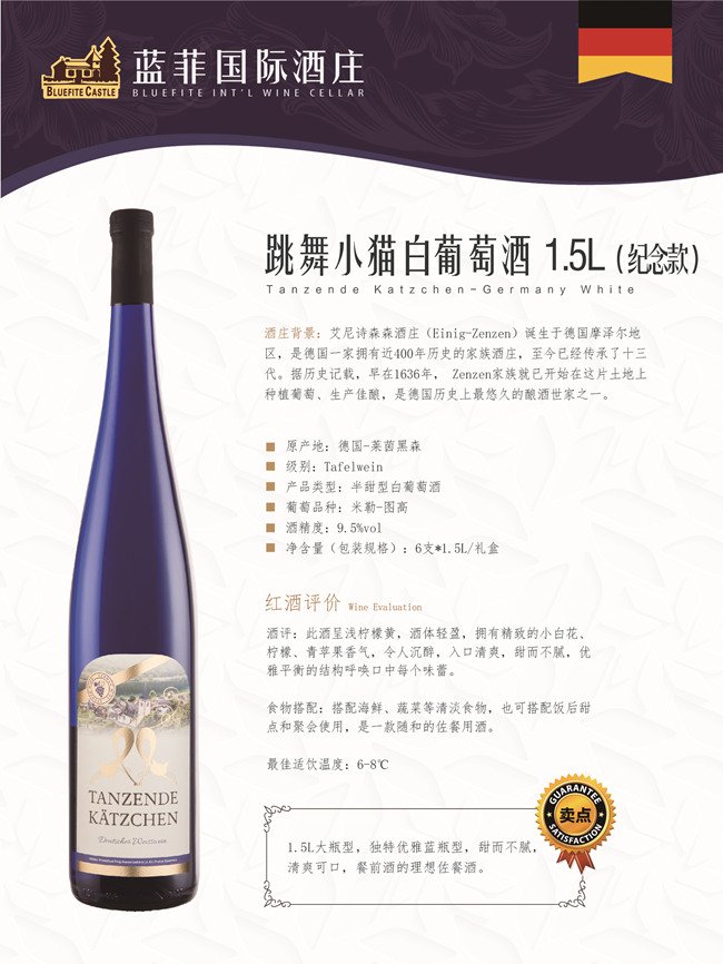 酒體呈淺檸檬黃色,擁有精致的小白花、檸檬、青蘋果香氣,令人沉醉;酒體輕盈,入口清爽,甜而不膩,優(yōu)雅平衡的結(jié)構(gòu)呼喚口中每個味蕾。1.5L大瓶型,獨特優(yōu)雅藍(lán)瓶型,最少適合各式各樣的聚會盛典,可搭配海鮮、蔬菜等清淡食物,也可搭配飯后甜點,甜而不膩,清爽可口,是一款隨和的佐餐用酒。