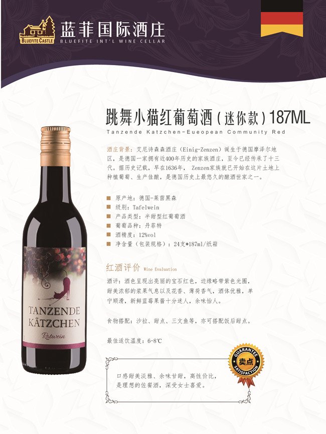 跳舞小貓紅葡萄酒187ml(迷你款),酒色呈現(xiàn)出亮麗的寶石紅色,邊緣略帶紫色光圈;甜美濃郁的漿果氣息以及花香、薄荷香氣;酒體優(yōu)雅,單寧順滑,新鮮藍(lán)莓果醬十分迷人,余味怡人。可搭配沙拉、甜點、三文魚等一起食用,亦可搭配飯后甜點。