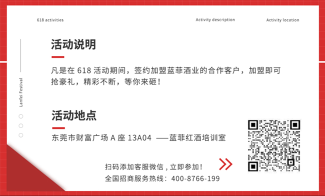 “618”購(gòu)物狂歡節(jié)(jié)是與‘雙11’遙相呼應(yīng)(yīng)的一個(gè)全民網(wǎng)(wǎng)購(gòu)狂歡節(jié)(jié),現(xiàn)(xiàn)已逐漸成為線上線下綜合的全民購(gòu)物狂歡節(jié)(jié)。為迎接618狂歡慶典的到來,藍(lán)菲特舉辦“藍(lán)菲618,我要發(fā)(fā)”系列活動(dòng),惠饋我們新簽約合作的加盟商/代理商們,與我們共建紅酒事業(yè)(yè)。