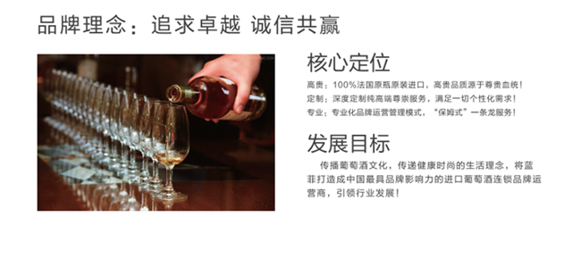 藍(lán)菲用十二年的經(jīng)(jīng)驗(yàn),打造了獨(dú)一無二的品牌體系和運(yùn)營(yíng)體系,在十二年的時(shí)間里一直秉持“追求卓越、誠(chéng)信共贏” 的經(jīng)(jīng)營(yíng)理念和服務(wù)(wù)宗旨,以客戶為中心、以市場(chǎng)為導(dǎo)(dǎo)向,致力于打造中國(guó)最有品牌影響力的進(jìn)口紅酒連鎖品牌。